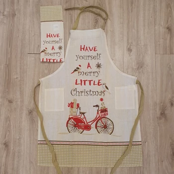 Karácsonyi kötény konyharuhával bicikli mintával bézs